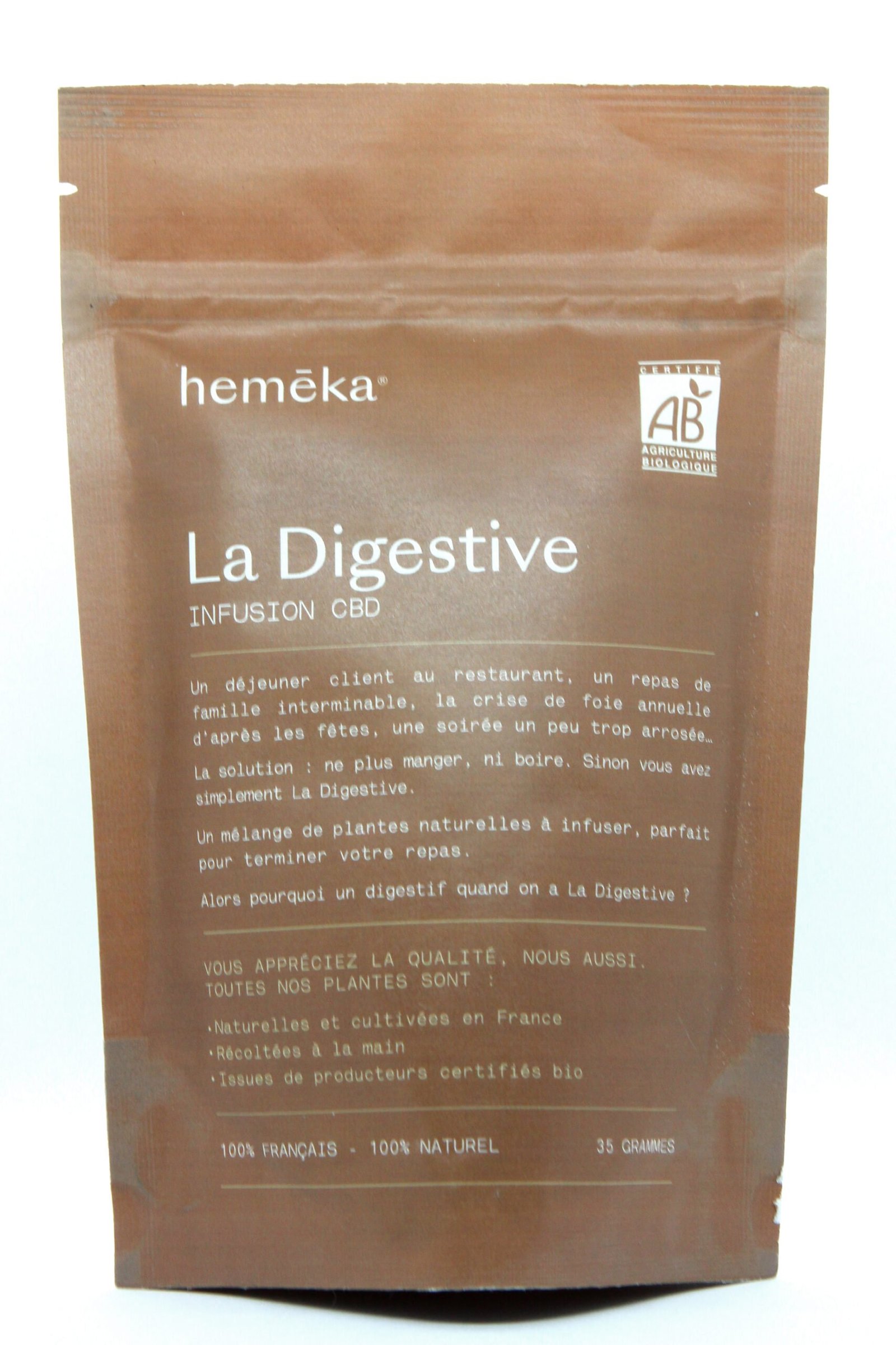 Certifiée « Agriculture Biologique », cette infusion CBD « La Digestive » de la marque Hemeka est parfaitement légale car elle contient moins de 0.2% de THC (molécule psychoactive de la plante de cannabis).